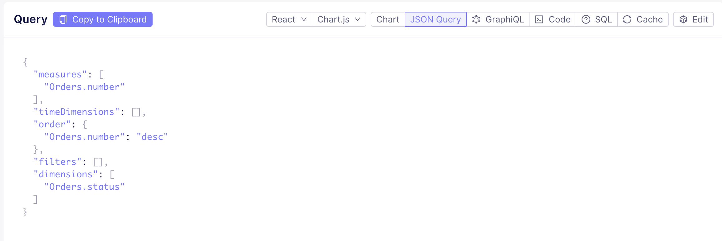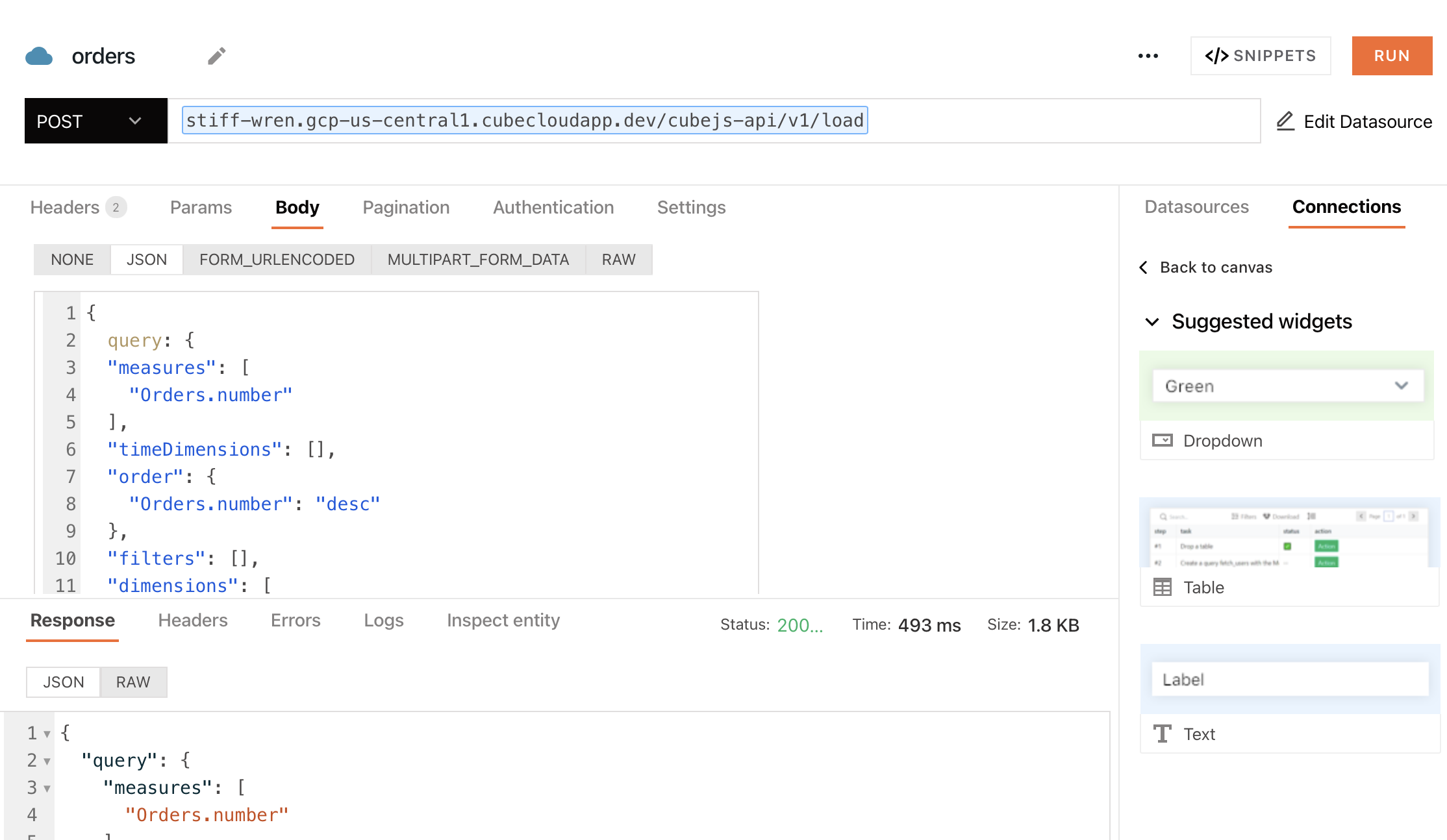 Get your Cube query in the JSON query format ready. You can copy it from Cube’s Playground or compose manually:query parameter for your JSON query.