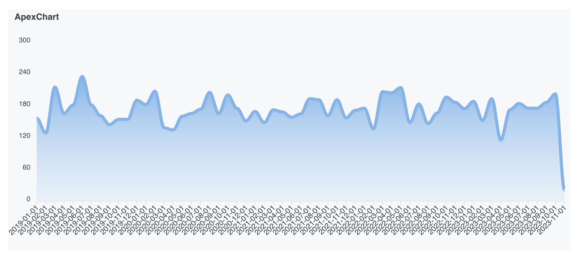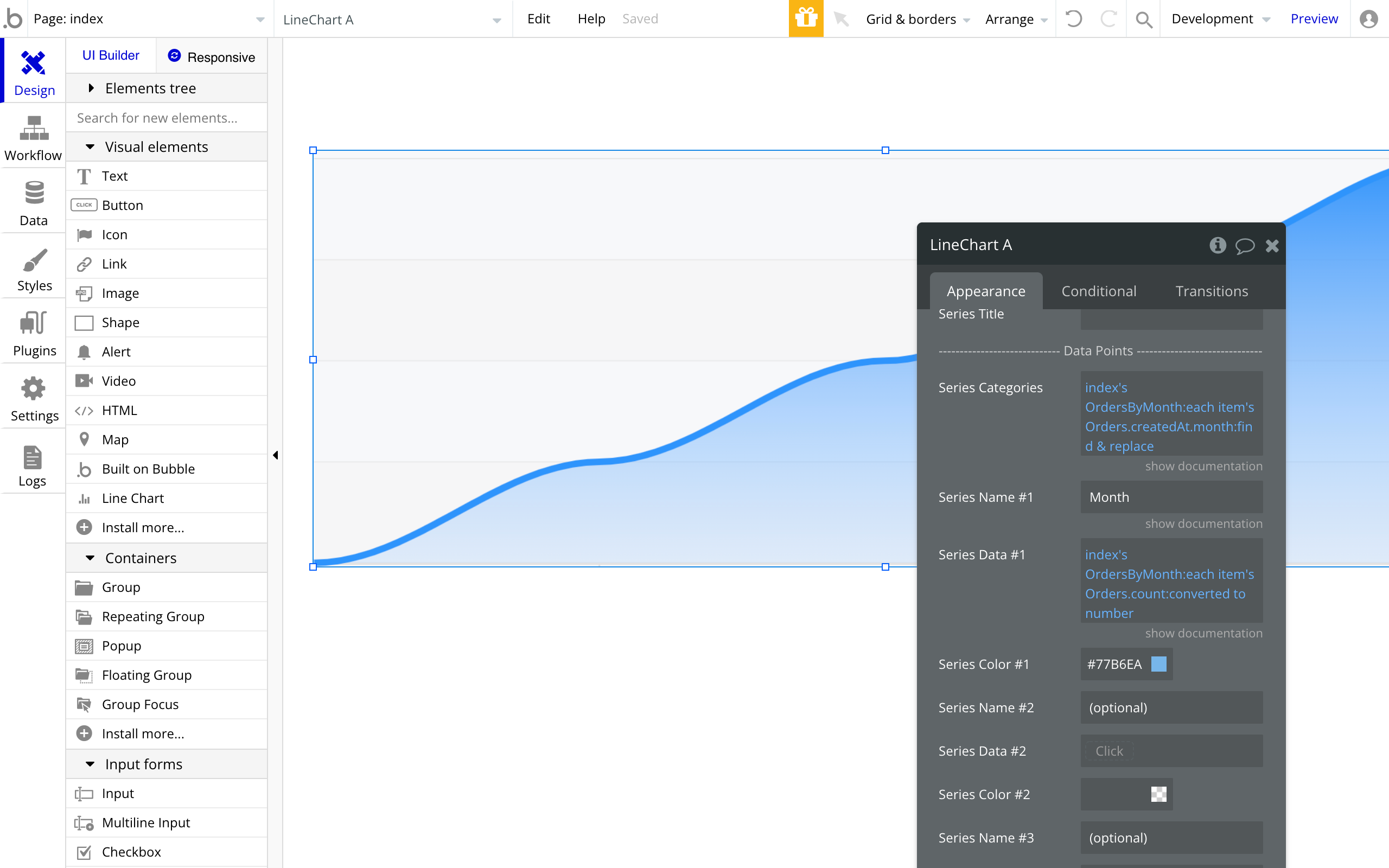 Bubble has an amazing feature where you can drag and drop UI components into the design dashboard. Once you added a chart, you configure the data points. More specifically, the series categories and series data. For the series categories and series data you need to select theindex and OrdersByMonth state followed by the data point
