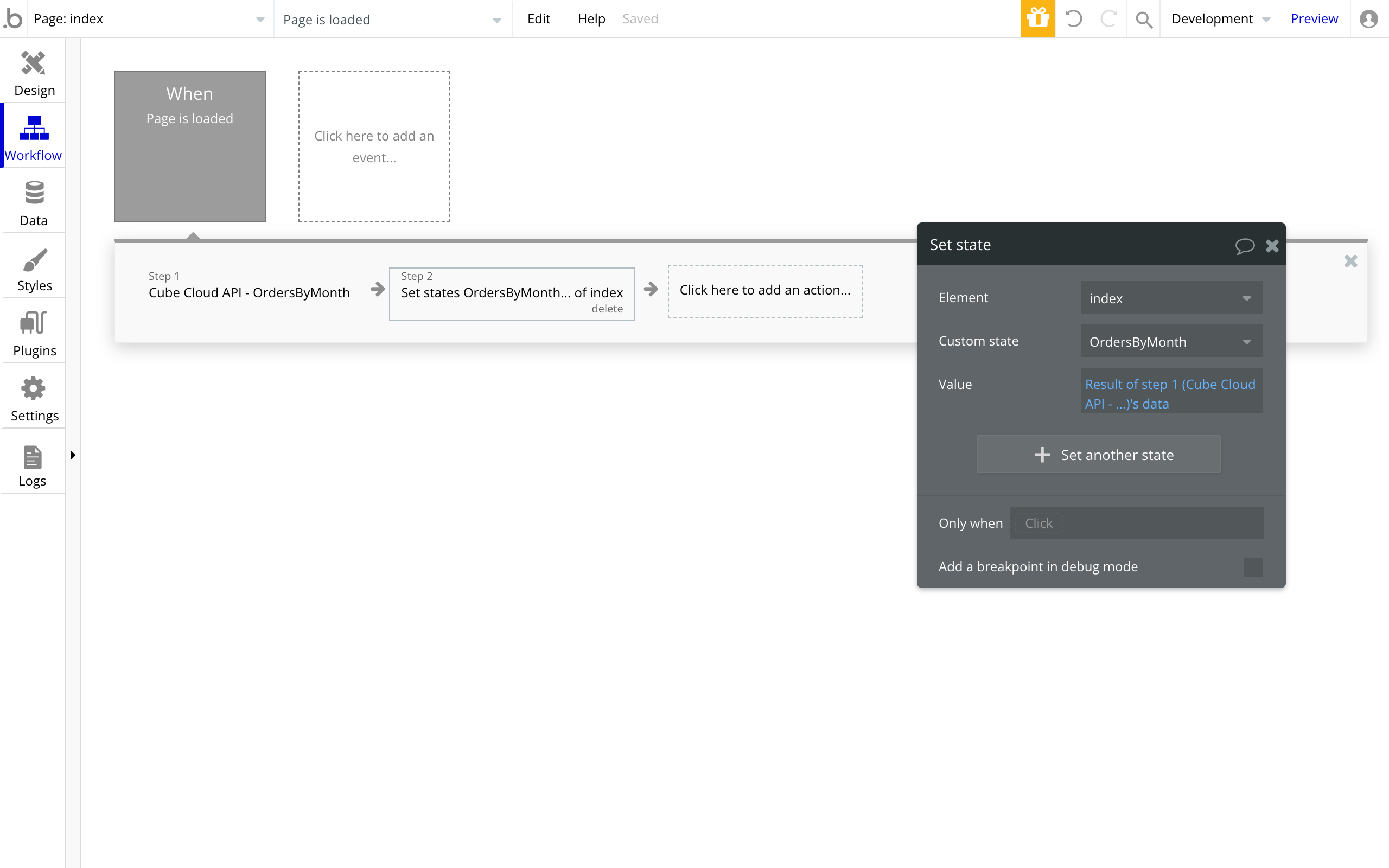 First, add a “Page is loaded” event. Add an action that uses the API connector plugin. Next, add another action to set the state of an element. Select the index element, and create a new custom state. In this example I named the custom stateOrdersByMonth and selected the data field of the API response. Make