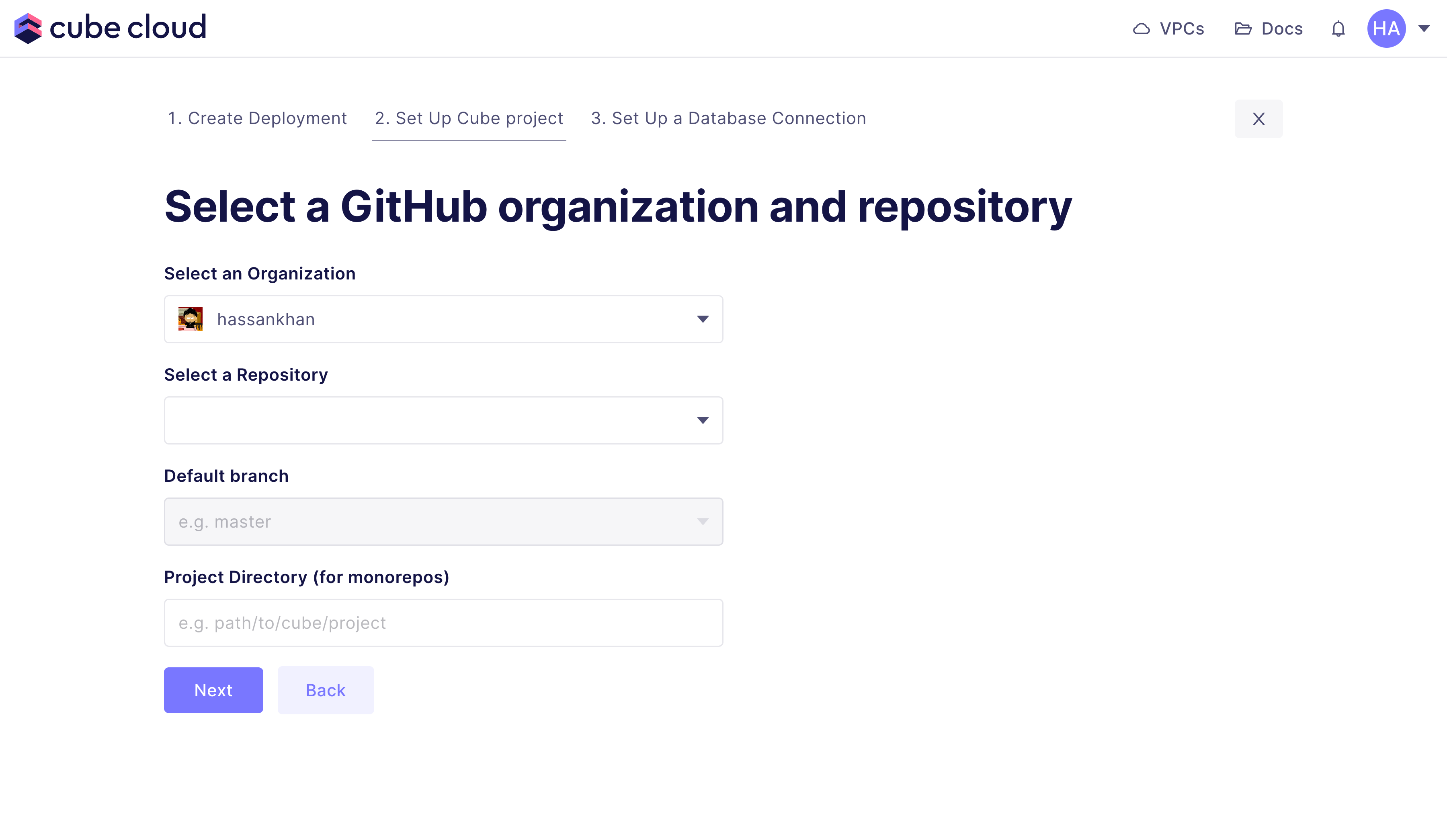Next up, click Import from a GitHub repository. This will pop open a GitHub app authorization dialog where you must first install the Cube Cloud GitHub app to the desired organization. After authorizing Cube Cloud to access your GitHub repository, you should see the following screen in Cube Cloud:Step 4: Connect your Database