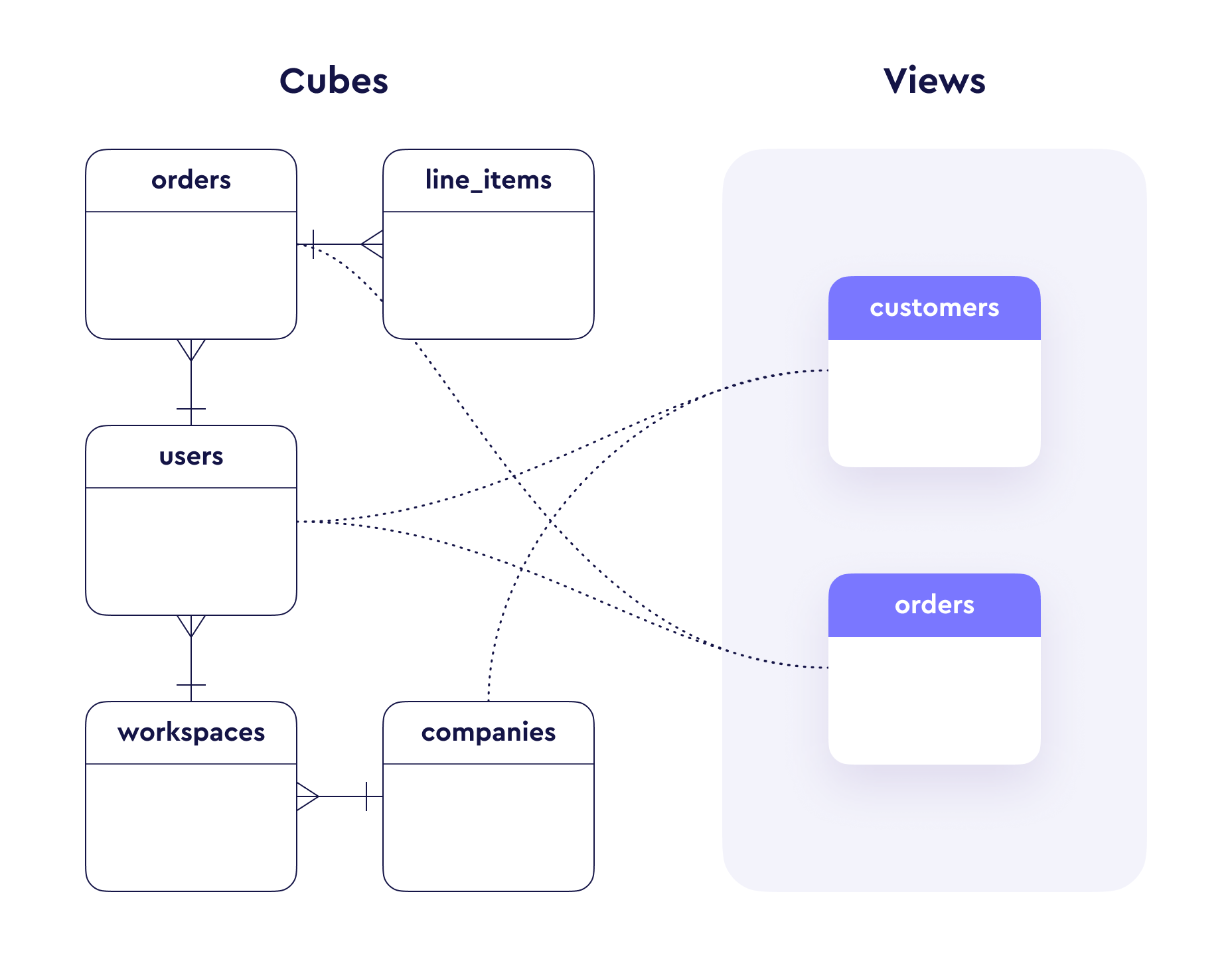 Views do not define their own members. Instead, they reference cubes by specific join paths and selectively include measures, dimensions, and segments from those cubes.orders view pulls in members from three cubes