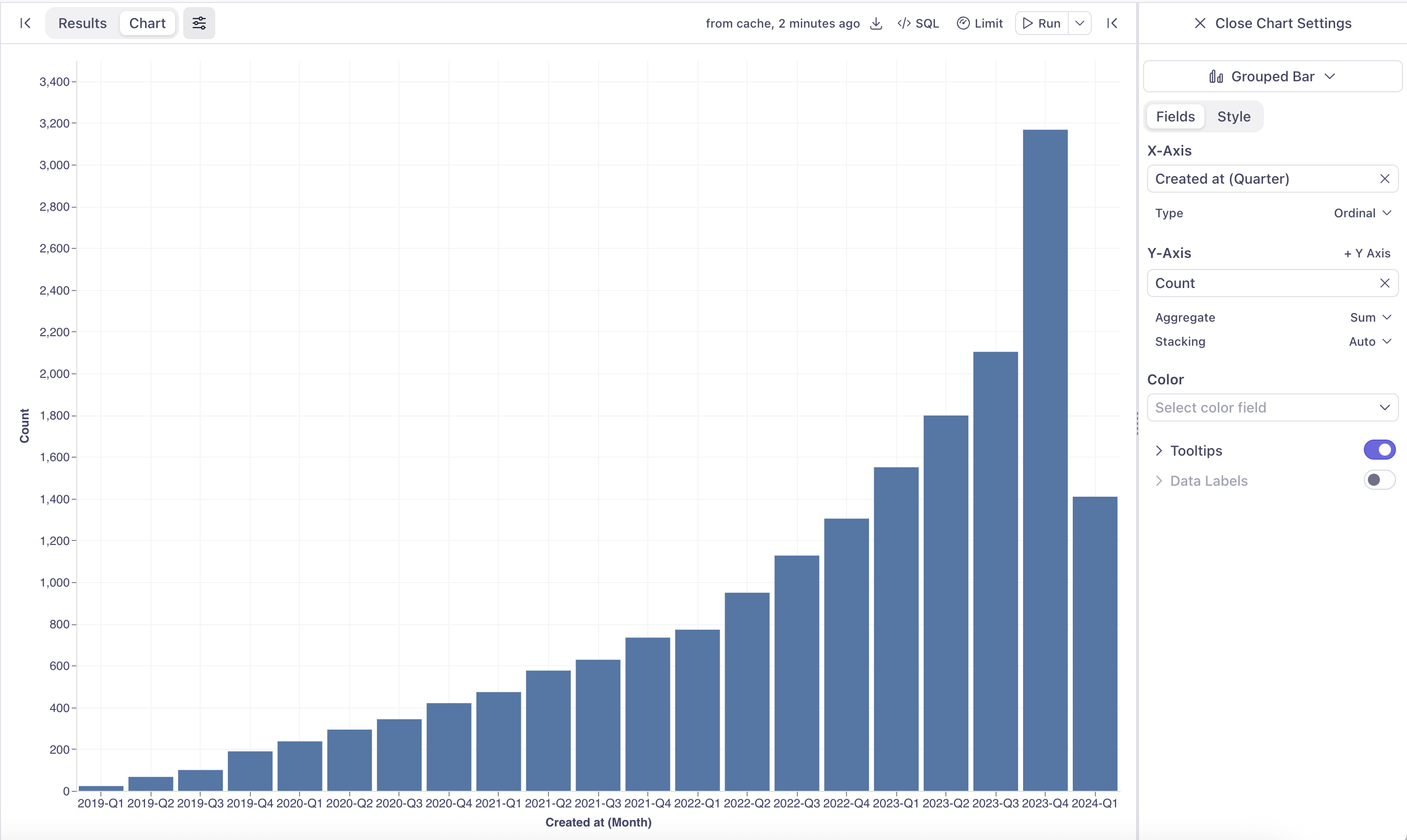 Assign one series to the right Y axis and set its mark type to Line in series configuration. This creates a dual-axis chart — useful for overlaying a rate on top of volume data (e.g. order count as bars, revenue per order as a line).Stacking